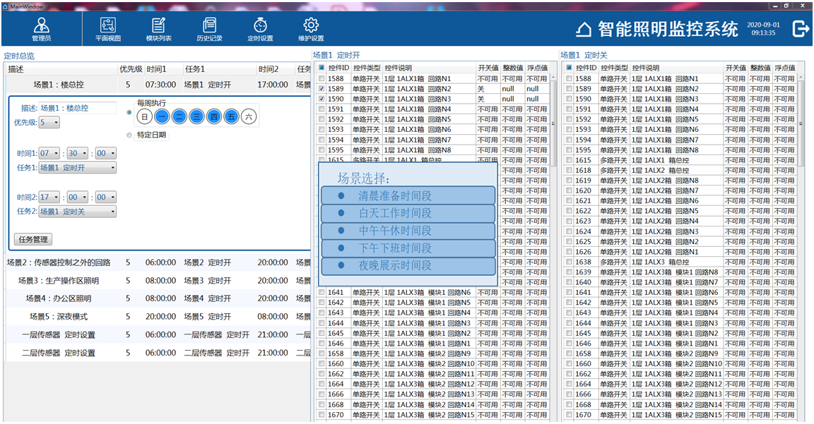 智能照明控制系统根据不同区域的功能需求,设定不同的场景模式,完成各种照明灯具的控制组合,达到美化工作环境、提高舒适度。