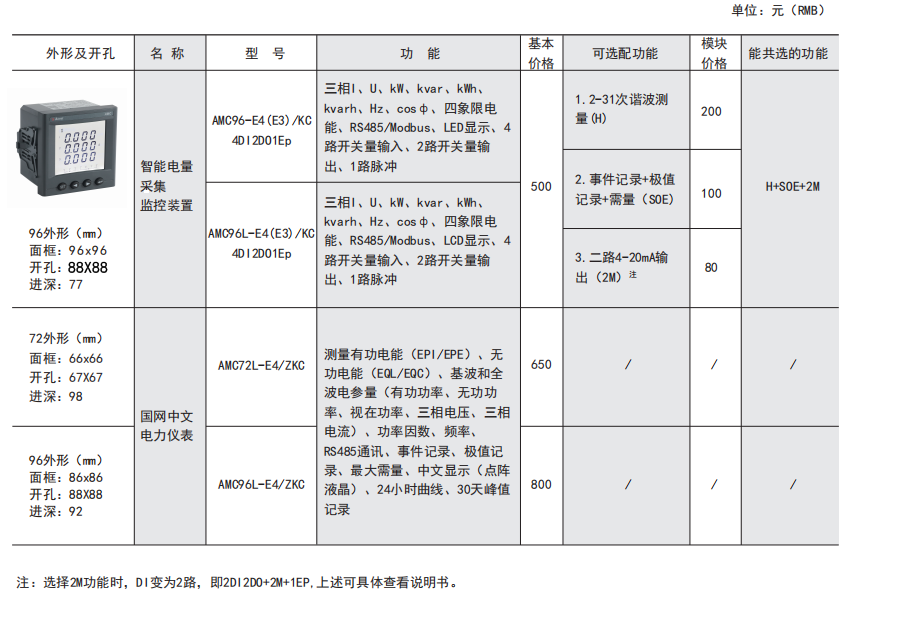 AMC 系列可编程智能电测仪表是针对电力系统、工矿企业、公用设施、智能大厦的电力监控需求而设计的智能仪表,它集成电力参数的测量(如单相或者三相的电流、电压、有功功率、无功功率、视在功率、频率、功率因数)以及电能监测和考核管理。采用高亮度 LED/LCD 显示界面,通过按键来实现参数设置和控制,非常适用于实时电力监控系统。可以直接取代常规电力变送器及测量仪表。作为一种智能化、数字化的前端采集元件,该仪表已广泛应用于各种控制系统、SCADA 系统和能源管理系统中。