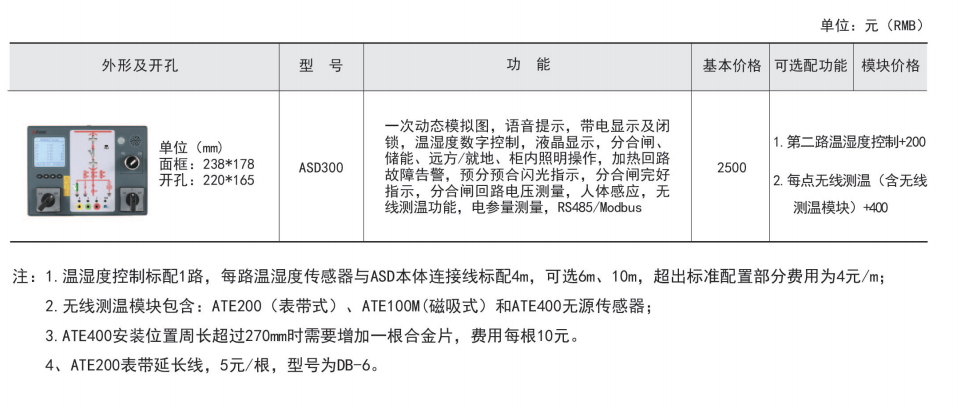 ASD系列开关柜综合测控装置具有一次回路模拟图及开关状态指示、高压带电显示、自动温湿度控制、人体感应自动照明、语音提示、电参数测量及RS485通讯接口等功能,集操作、显示于一体,直观地体现柜内元件的工作状态及工作环境。