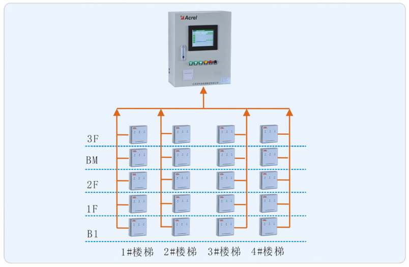 系统采用安科瑞防火门监控系统,该系统主要采用分层分布式网络结构,系统结构为:站控管理层、网络通讯层和现场设备层。其中黄岩博物馆项目现场设备分布为B1至3F常闭防火门。该系统监控所有楼道内的常闭防火门且实时监测防火门状态,如有异常会后台报警。所有监测模块通过二总线铺设至消防控制室,防火门监控主机从而完成对监测模块的采集并监控。