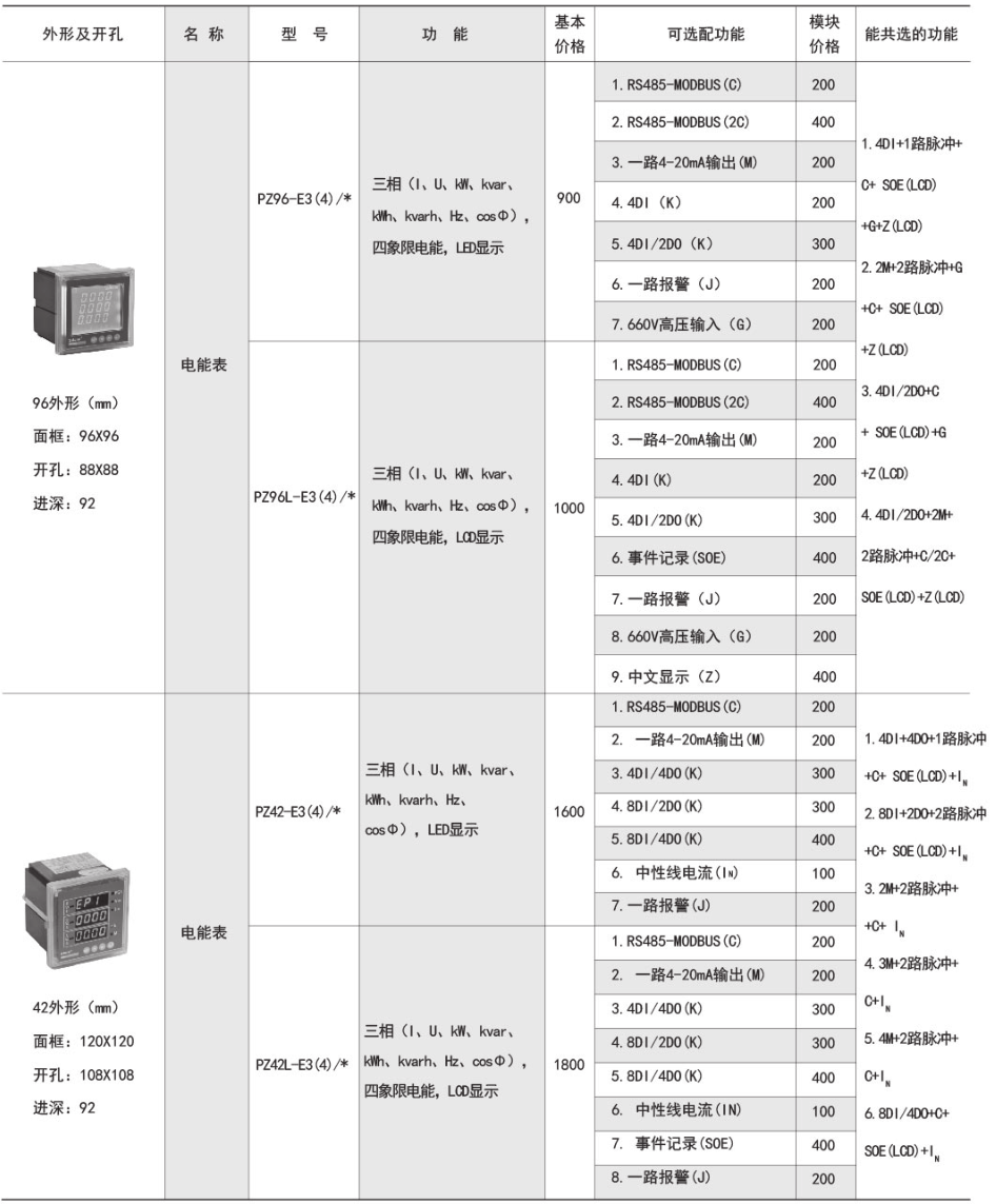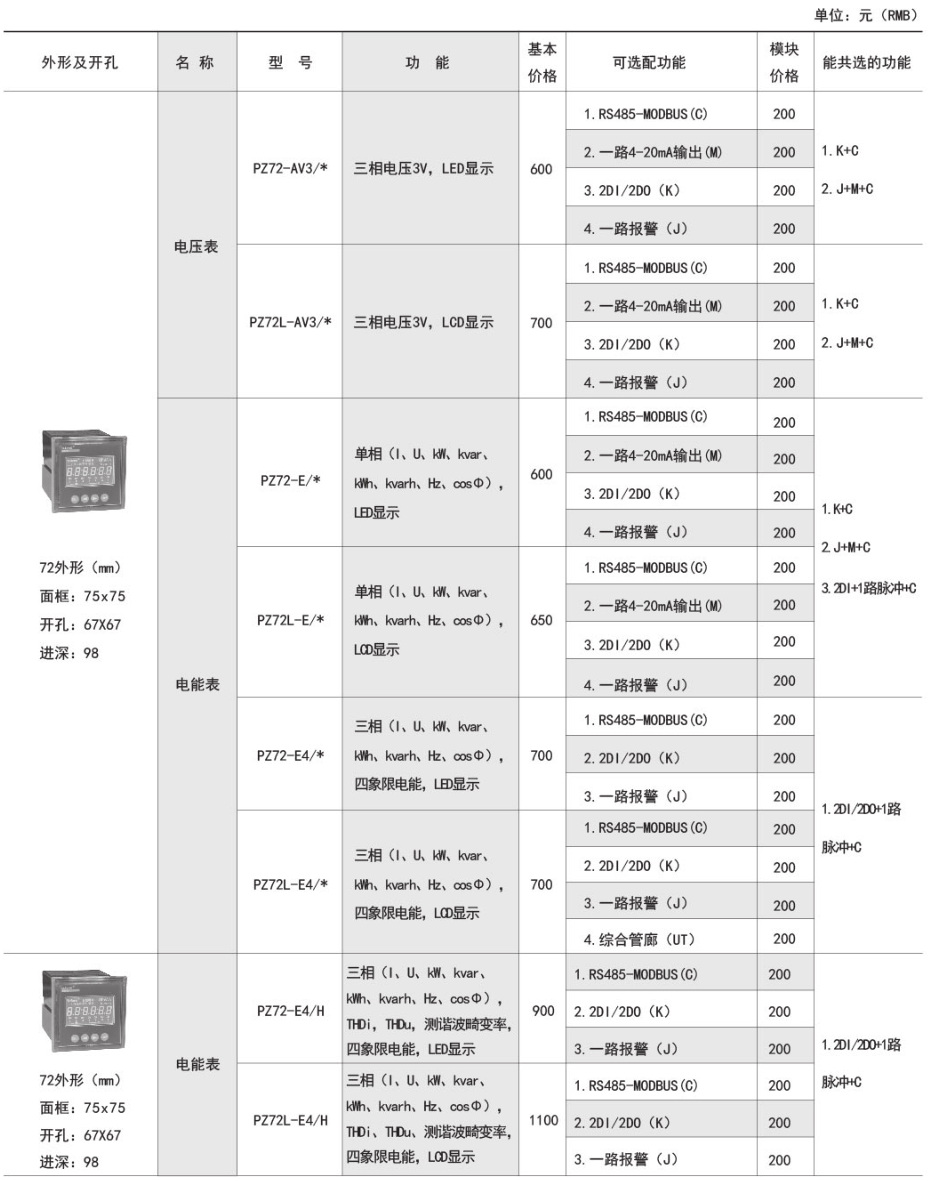 产品简介:该系列仪表采用交流采样技术,能分别测量电网中的电流、电压、功率、功率因数和电能等参数。可带RS485通讯接口、模拟量数据转换、开关量输入/输出等功能,实现电力参数、电气元件工作状态的远程传输,便于后台监控系统集中检测。